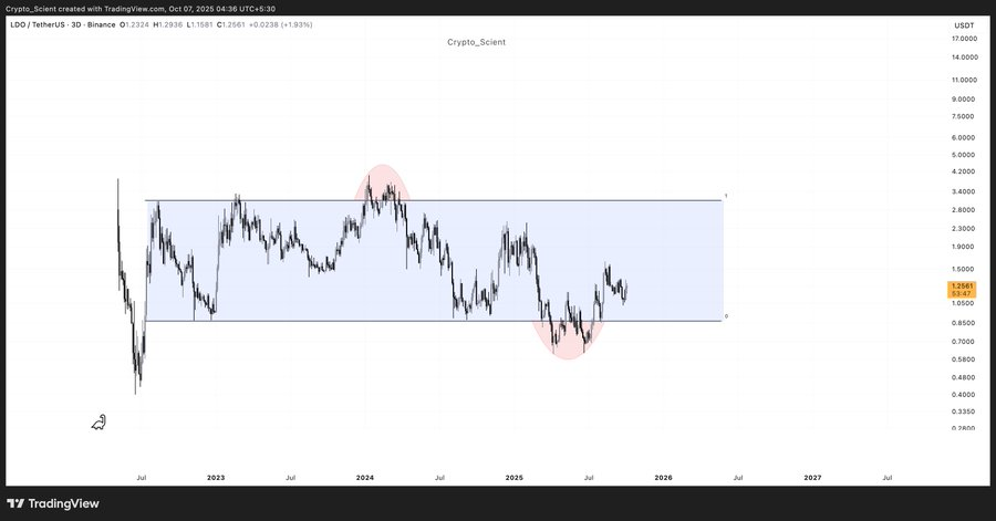 Crypto_Scient分析显示,LDO/USDT三日线图自2022年中以来始终在0.85-3.20美元水平箱体震荡。该结构呈现多年积累形态——每次上攻3.20美元遇阻回落,而逼近0.85美元时又引发新一轮买盘。
