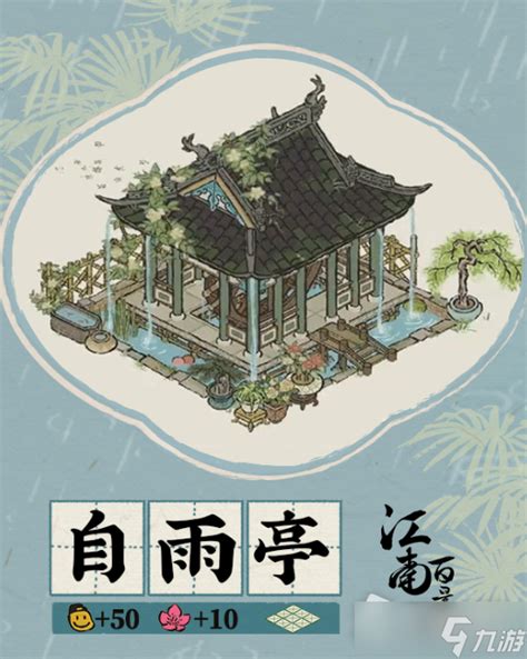 在《江南百景图》的江南水乡画卷中,自雨亭作为一座兼具实用价值与文化底蕴的3×3规格建筑,凭借其独特的水力降温机制成为玩家布局中的热门选择。这座以唐代“自雨亭”为原型的建筑,通过水车将活水引至亭檐形成人工水帘,既还原了古人“引水环亭,暑气尽消”的智慧,又承载着阿瑶与方家哥哥的夏日邂逅故事,成为游戏中兼具功能性与叙事性的特殊存在。以下从获取途径、布局技巧与文化内涵三个维度,深度解析自雨亭的获取与运用策略。
