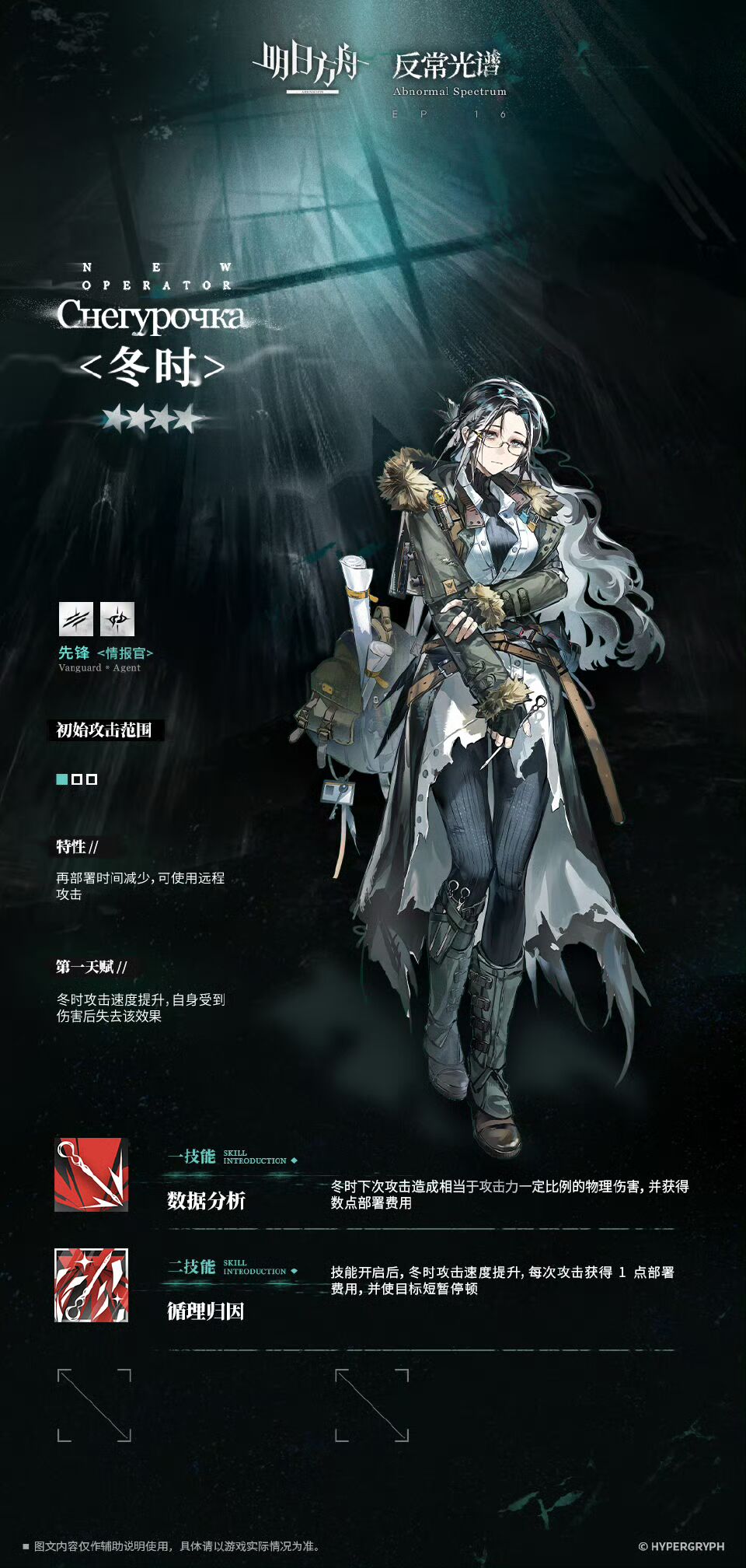 本篇为大家带来的是明日方舟的全新四星干员冬时的技能介绍,冬时是先锋分支中的情报官,情报官分支几乎无废卡,四星的情报官在肉鸽里算是一张非常好用的卡了,培养难度低,强度虽然有限,但至少肉鸽里便宜。