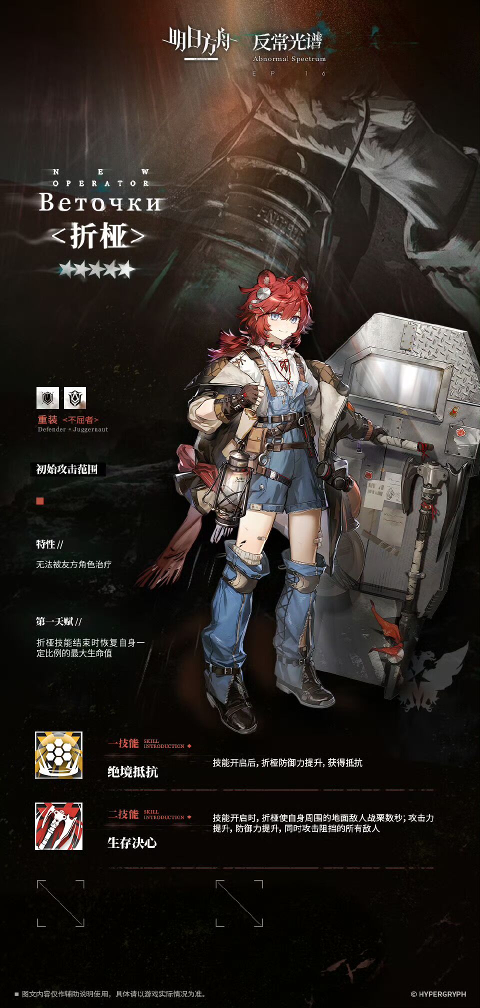 本篇为大家带来的是明日方舟的全新五星干员折桠的技能介绍,折桠是重装分支中的不屈者,无法被友方角色治疗,但是在技能结束的时候可以恢复自身一定比例的最大生命值,因此技能的开启时间很重要。