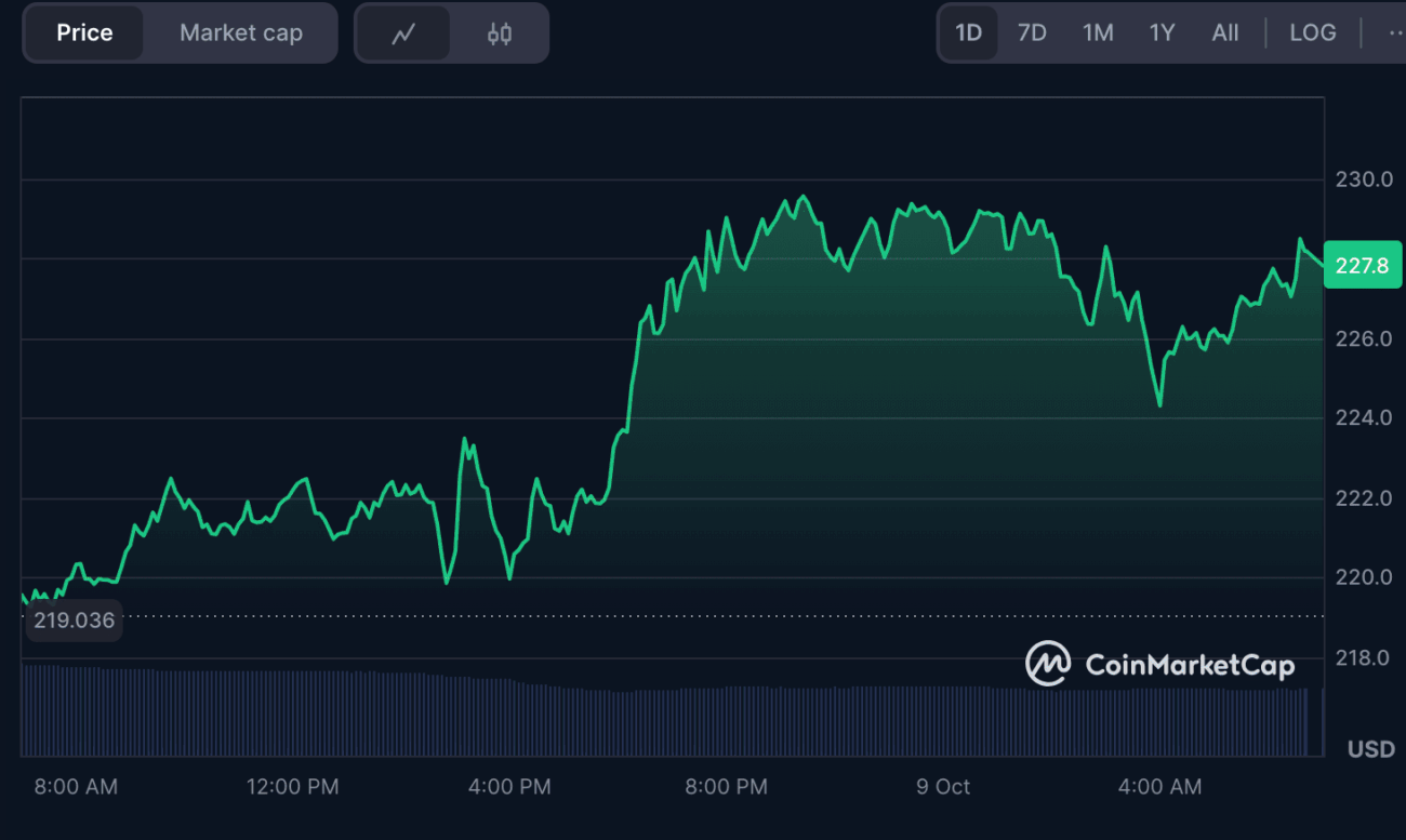 CoinMarketCap数据显示,SOL价格24小时内上涨3.56%至227.40美元,跑赢加密货币市场0.69%的整体涨幅。