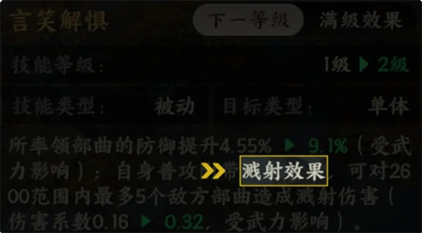 应用场景:受到普攻伤害能提升部曲防御并造成伤害,可以针对性的压制追击流阵容与弓兵阵容,后期团战中兼顾前排抗伤的同时还能有一定的输出能力。
