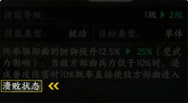 【溃败】:敌方部曲兵力低于一定比例时,造成普攻伤害有概率使敌方部曲溃败。