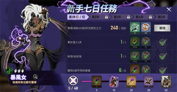 新手任务:完成7 日指定目标(如通关主线 2-10、英雄突破 1 次),可解锁 SSR「暴风女」及专属战衣碎片 ×20;