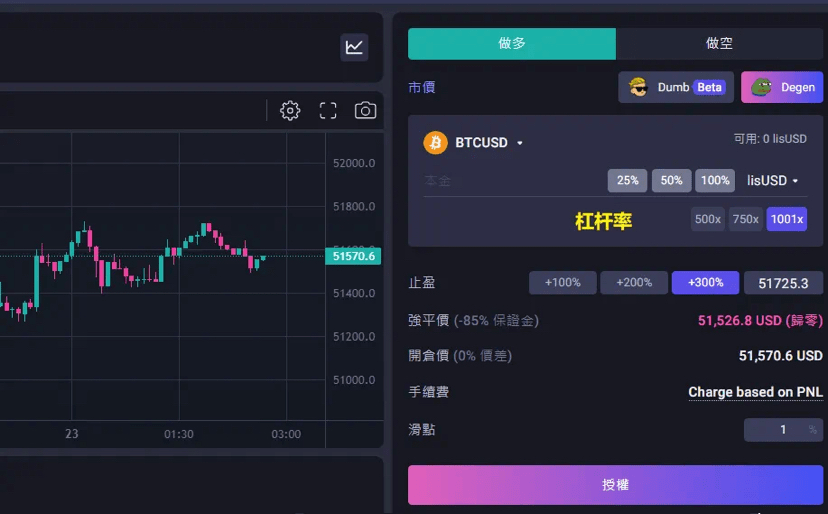 Degen模式可以获得较高的杠杆率,最高达到1001倍,以及0滑点交易和较低的手续费,主要在合适价格开好仓位以及杠杆率,设置好止盈即可。