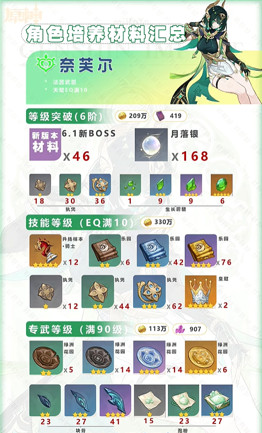原神新角色奈芙尔培养材料,前瞻直播中爆料出来的材料有需要打新版本的BOSS霜夜巡天灵主,其余材料可以在须弥内获取,想要提前攒材料的小伙伴看过来