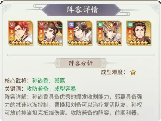 孙尚香具备优秀的爆发收割能力,郭嘉具备强力的减速冰冻控制,曹操和刘备可以治疗复活队友,孙权可放前排当坦克抵挡伤害。攻防兼备的阵容,前期利器。