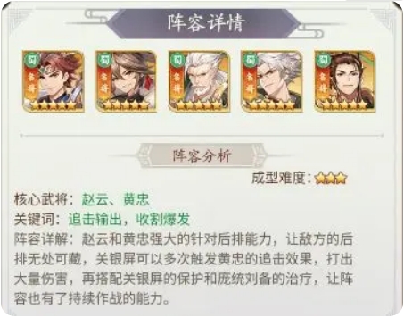 赵云和黄忠强大的针对后排能力,让敌方的后排无处可藏,关银屏可以多次触发黄忠的追击效果,打出大量伤害,再搭配关银屏的保护和庞统刘备的治疗,让阵容也有了持续作战的能力。