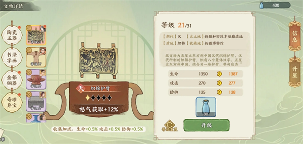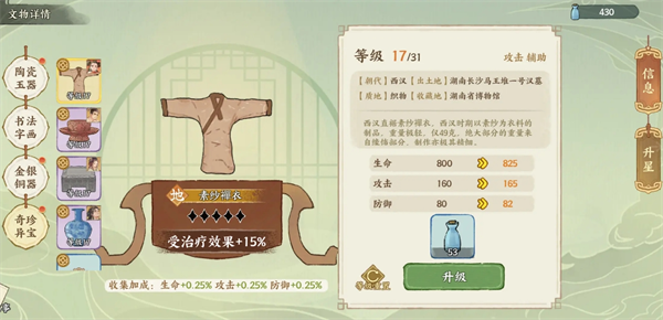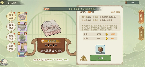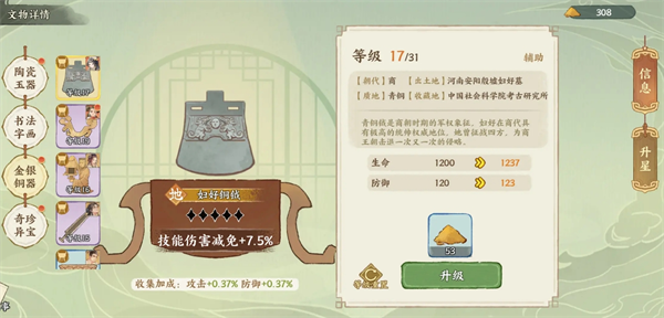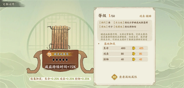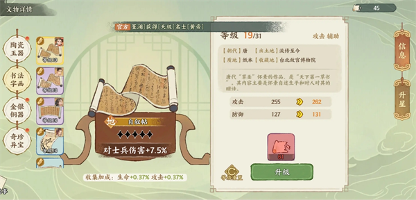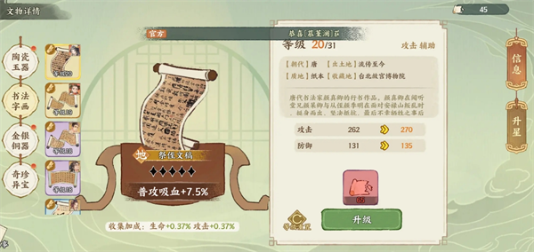 在华夏绘世录游戏中,文物是提升名士战力的核心要素。一共有17个天地品文物需要合理的安排搭配给名士,品级越高的文物加成就会越高,以下是对于文物搭配建议分享。