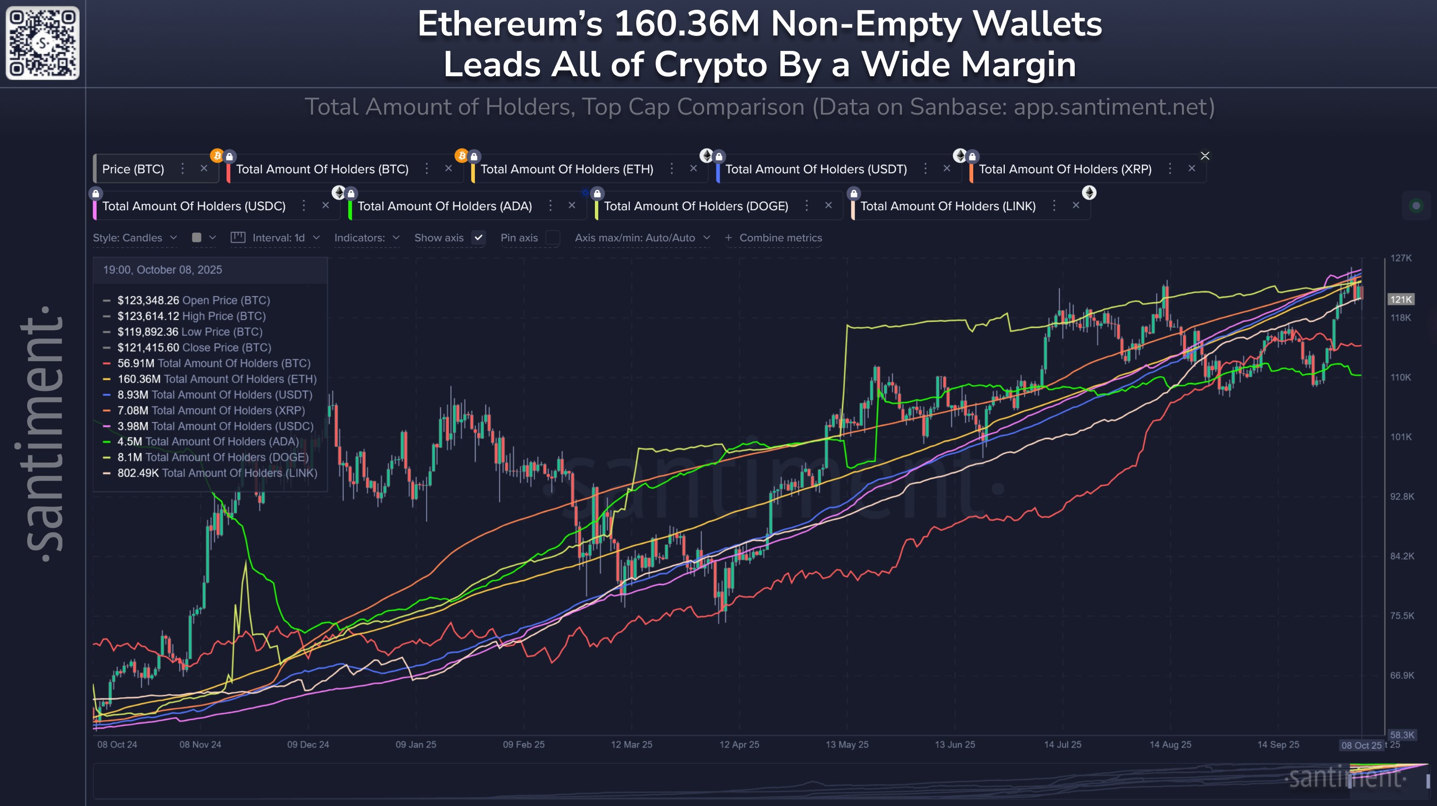 链上分析公司Santiment在X平台最新发文中,对比了加密货币领域各代币当前的总持有者数量。