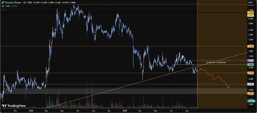 TON突破上升趋势线后可能从2美元跌至1.88美元,但若能收于关键阻力线上方仍存反弹可能。来源:TradingView上的CryptoandForexplus