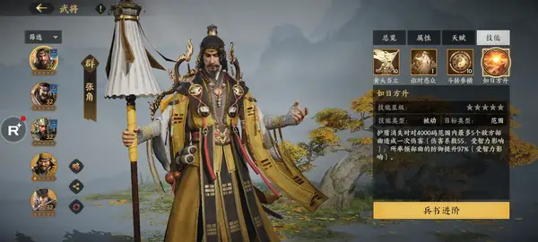 黄天当立:对敌方单体照成伤害并且提升区部防御(受智力影响)