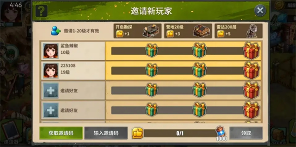 只能在20级之前填别人的邀请码,只要你超过20级就不填了,另外里面的奖励需要你邀请的小伙伴最少到25级,勘探是25级才能开的,营地20级