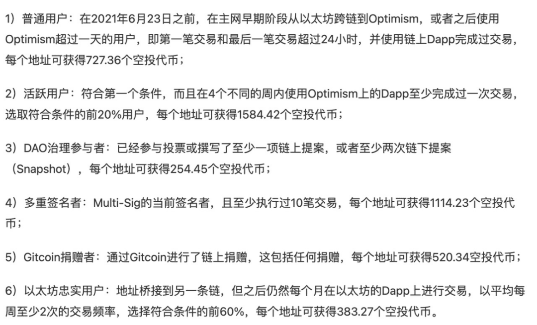 Optimism -以太坊的二层网络之一,Optimism的空投规则,我认为这是一次很经典的空投案例。OP将代币空投给六类用户: