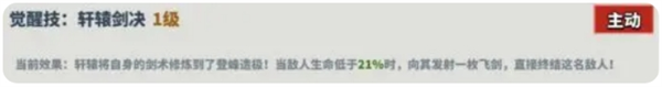 描述:轩辕将自身的剑术修炼到了登峰造极!当敌人生命低于21%时,向其发射一枚飞剑,直接终结这名敌人!
