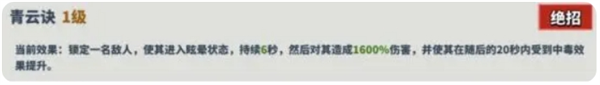 描述:锁定一名敌人,使其进入眩晕状态,持续6秒,然后对其造成1600%伤害,并使其在随后的20秒内受到中毒效果提升。