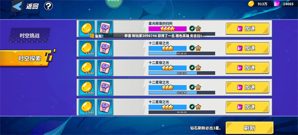 能获取大量的高级召唤卷和橙色碎片,类似与很多游戏的通天塔,闯的层数越高,奖励就越多。时空之门还有一个时空探索,这个就是我想说的,探索的东西有1-5个星级,每个星级都有不同的奖励。通常我们选择3星级就可以了,但选什么材料呢,不卖关子,只选一种技能书,因为其它材料都很容易获取,技能书获取难度较大,而时空探索就正好填补了这个空缺。