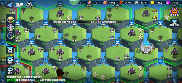 顾名思义,就是需要我们花费时间与劳动,才能收获的成果。空岛可采集的有四种,金矿、石矿、林场、牧场,采集的资源可以对家园进行建设,也可以通过家园商店购买我们所需要的资源。采集可以派三个队伍,采集的时间快慢根据英雄的星级来评定。优先级采集联盟领地里面的矿,能加50%的采集速度。