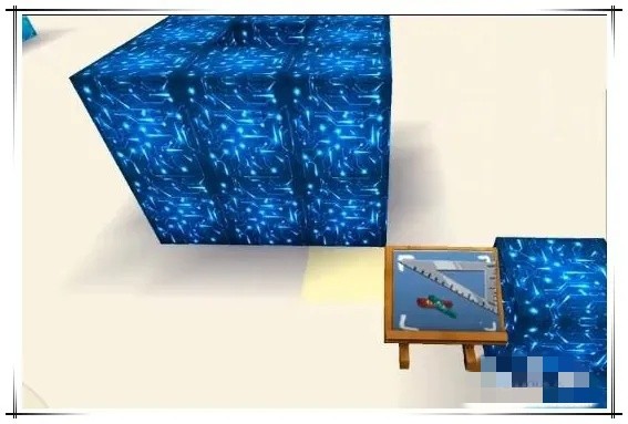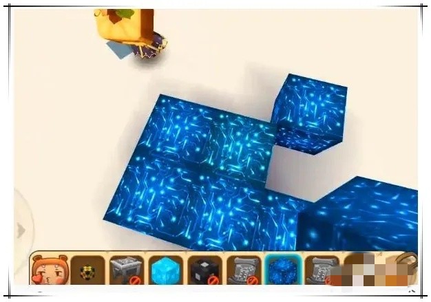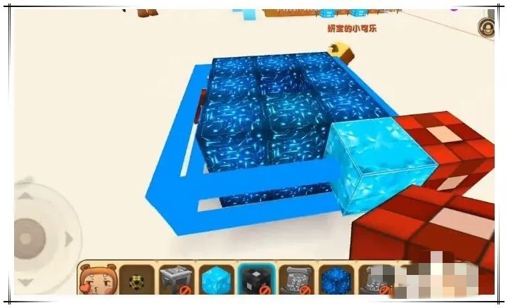 迷你世界区域复制方块操作步骤三:在确认区域复制方块放置完后,出现的立方体的标记范围已经完全履盖了复制建筑,接着将蓝色工作台放到一个区域复制方块的旁边,确认复制区域。