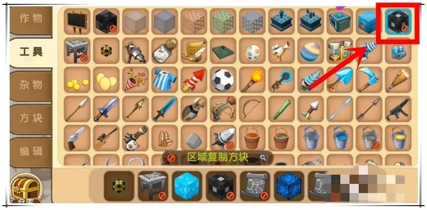 迷你世界区域复制方块用法攻略是在创造模式中,打开物品栏工具红色箭头指向的黑色格子方块,需要复制的方块放置在复制器顶部,在立方体对角线位置再放一个复制器,立方体内会填满被复制的方块,最大范围16格。