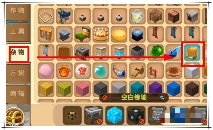 迷你世界区域复制方块操作步骤四:然后,拿出“杂物”中的“空白卷轴”,再点击一下蓝图工具台,打开蓝图工作制的制作窗口。