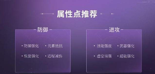 进攻推荐技能强度、虚空增强、超能强化、武器强化,注意前期不要过度追求。