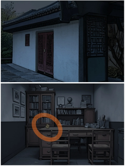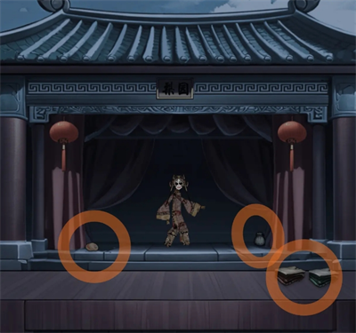 走右面(前面有小高能突脸注意!!!),拿取戏台左右的物品,茶包和胭脂,台子上还有红绿两种颜色的戏服(这里的戏服拿取与文思堂鬼脸的颜色有关,但小编试了好几次应该是纯随机的,直接随缘选择穿吧)