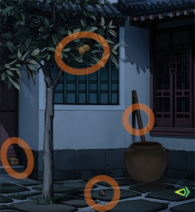 别雅园:进入,先走左面,拿起地上的钩耙、烂枇杷和左下角的砝码,用钩耙够取树上的枇杷,获取枇杷。