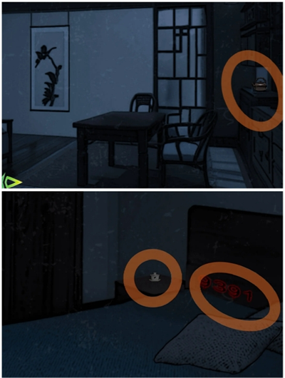 西院:杨婉兰房间:拿起柜子上的茶壶,左走拿取床头柜上的茶杯,点击枕头露出后面的密码9391