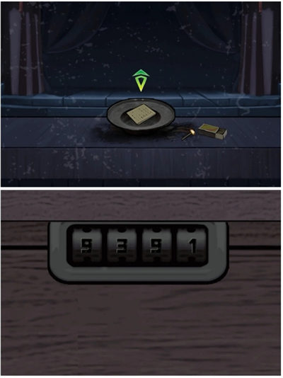 向右将烧火盆放到燃烧的灰烬上,将冥币放里面用火柴点燃,出现鬼魂说在后台,来到后台点击椅子上的盒子根据西院枕头后面的数字密码9391,拿到女鬼的头。
