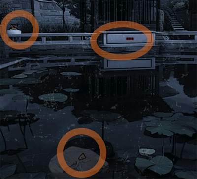 回到别雅园走中间来到水池,点击水池对面亭子下的凹槽,将收集的四个字牌按照升棺见喜顺序放上去,获得荷包和红鞋。