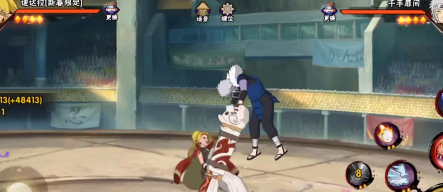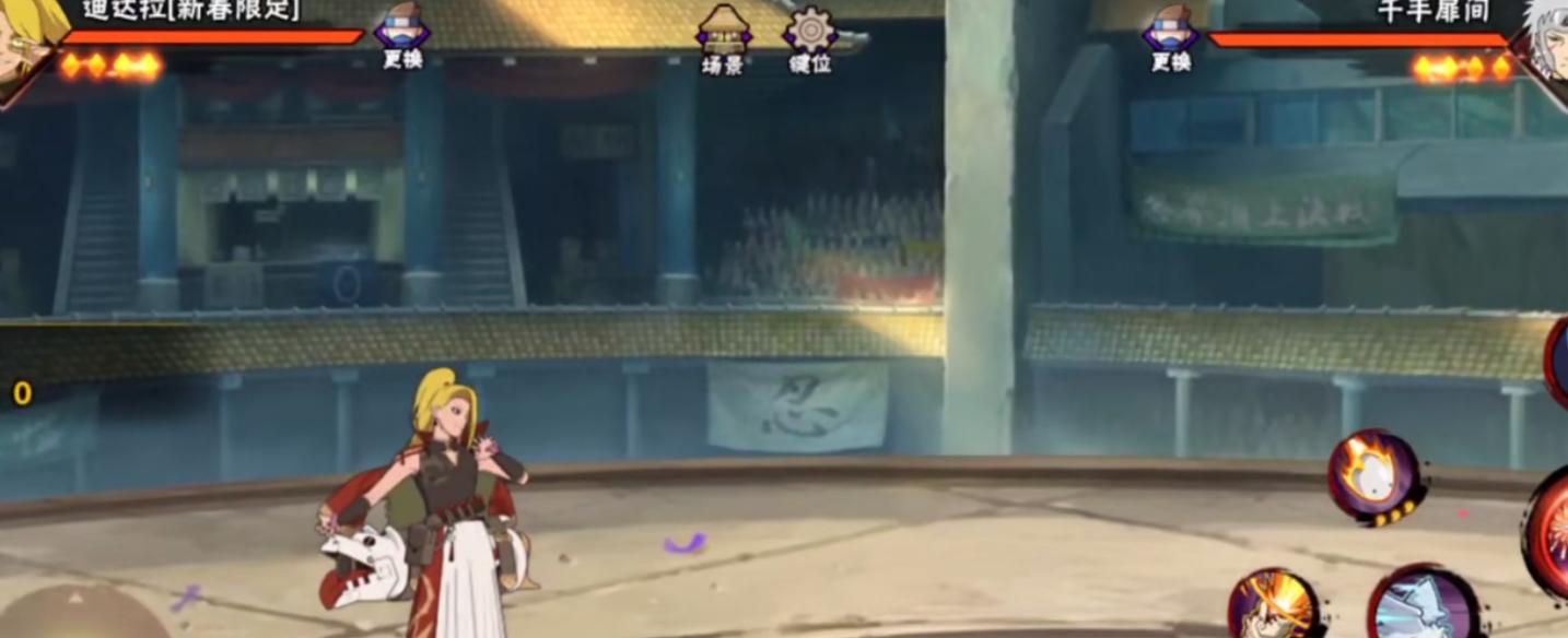 子技能第一段为向前抓取,命中后将敌人击飞,冷却时间8秒,命中后不可接站立攻击。新春迪达拉共拥有三个充能点,子技能与二技能共享充能,每使用一次技能均消耗一点。该抓取技能命中后敌人无法替身,但伤害结束后可替身,全程不具备扫地效果。