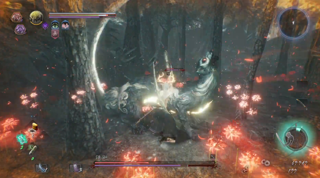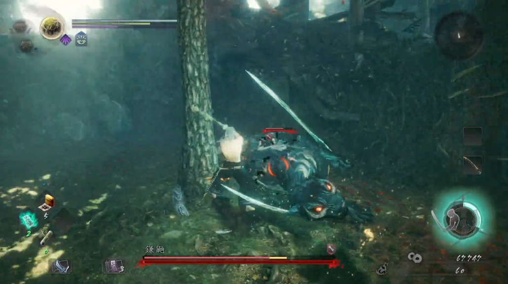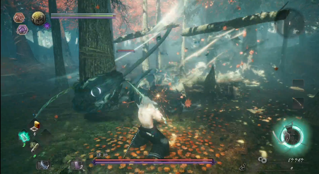 若不擅长妖反,应及时向后闪避拉开至少三个身位。当其缩成球状旋转时,保持冷静并向其身后移动可完全避开风刃,待其结束旋转后上前攻击。当镰鼬血量低于三分之一时会进入常暗状态,分身成三只同时冲锋,此时不应贪刀,应以防御或走位周旋为主,待真身使用红光投技后再集中攻击本体。分身受一定伤害会消失,但正面硬刚风险较高,不建议尝试。此战最忌盲目强攻,镰鼬连招间隙短,每次攻击后需保留约三成精力用于防御和回避。