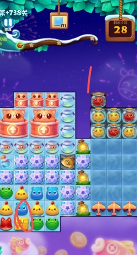 738隐藏关需同时应对雪块、蜜罐与蜂蜜三层障碍,目标是将蜗牛从底部解锁。蜗牛初始位置被多层雪块覆盖,需通过消除上方动物逐步破除雪块,显露下方路径。建议优先观察雪块密集区域,利用底层连消带动上层元素下落,为蜗牛移动创造条件。
