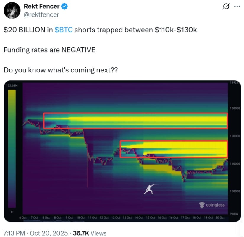 加密货币交易员@rektfencer在X平台指出:"200亿美元BTC空头被困在11-13万美元区间。资金费率是负值。知道接下来会发生什么吗?"
