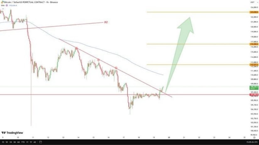 BTC突破1小时下降趋势线——多头苏醒,下一目标位123K。来源:@CryptoBull009 via X