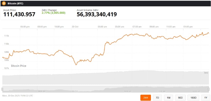 比特币(BTC)截稿时报111,430美元,24小时涨幅2.77%。来源:Brave New Coin