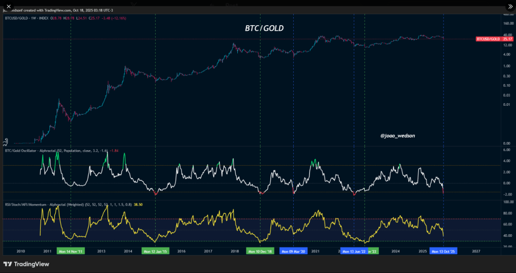 CryptoQuant分析师Joao Wedson指出,BTC/黄金比率已闪现一系列底部信号,这或将成为两大资产走势关系的转折点。