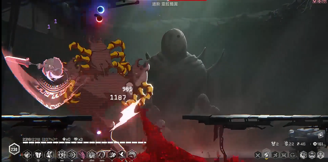 三是短暂蓄力后向场景另一端冲刺,并发射两颗球。玩家应在蓄力时移动到Boss身后,观察其冲刺方向,在出现感叹号闪光时向上跳跃,随后清理球体。当亚拉酷泥血量降至一半时进入第二阶段,会向地面吐出红泥,并在空中发射孢子。玩家需迅速用大范围技能清理孢子,避免触碰红泥,否则会持续掉血并减速。