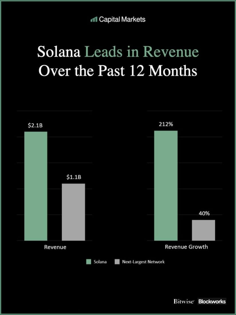 Solana的链上增长仍是其持续韧性的核心支柱。Capital Markets数据显示,该网络以21亿美元年收入领跑行业,同比激增212%,远超竞争公链。