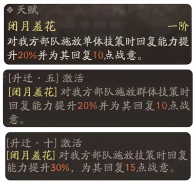 闭月羞花1阶单体技能治疗增幅,并且所有单体额外回复10战意。