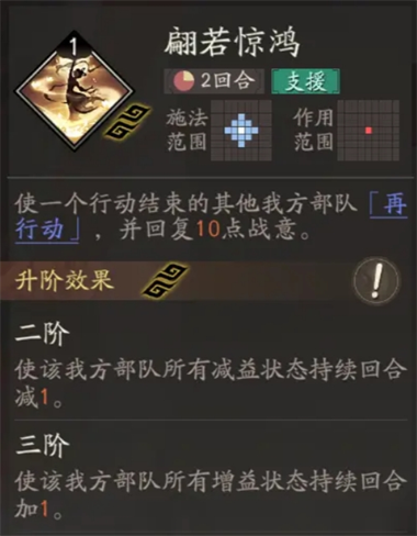 2,3阶则分别缩短减益buff持续回合,增加增益buff持续回合,很容易让被再动的单位摆脱不利局面起死回生,是最重要必须携带的技能。