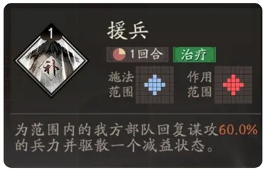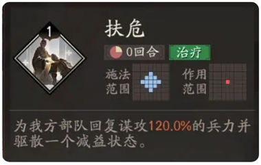 优质被动技能,主要用于高压局的及时回复,回复量从内测的谋攻40%增加到了60%。注意此被动无法触发天赋的回复战意,并且减益buff回合-1的效果并不包括控制,我方单位如果中了眩晕,混乱等控制效果,本技能无法驱散。