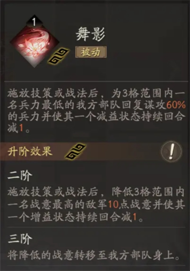 3阶可将2阶降低战意转移给我方,但是注意PVE副本中只有极少数敌军有战意条,对于没有战意的目标是无法转移战意的,同时无法触发副将严珩的效果。