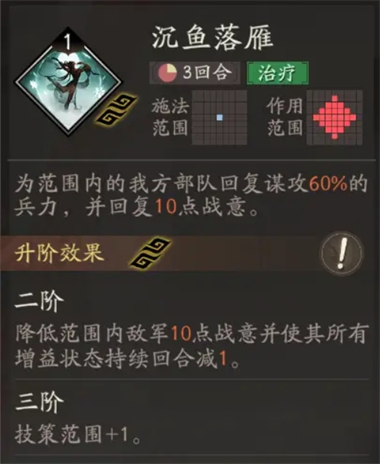 总体属于对策性强,但是又不能乱放的技能,可根据需求选择性佩戴,除2阶类似群体驱散敌军所有增益buff的霸道效果之外,配合严珩可大范围给友军施加<昂扬>也让这个技能总体评价极高,唯一缺点是天赋2阶启用
