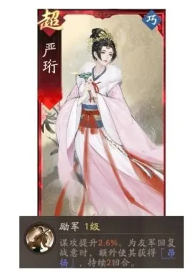 2阶群体技能可获得上述同样效果,搭配副将严珩可以实现一次性对大量我方单位施加<昂扬>。