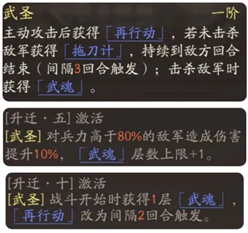 升迁10时,让起手输出更暴力,而且缩短了<再行动>的冷却期。开局即可完成一动击杀杂兵,再动直接触发<威震华夏>的额外效果,实现单人首回合最多可击杀6个目标的壮举。