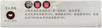 要求关羽和其他2名<勇>主将同时上场触发,3名<勇>主将阵容单一容易导致己方被敌军属性克制而陷入被动局面,并且增伤仅针对满血敌军生效,因此不太推荐。