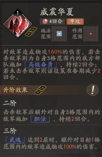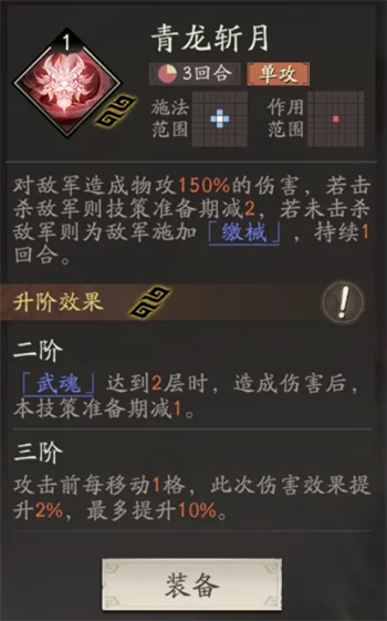 优质的通用技能,前期搭配<青龙斩月>可实现接近150%倍率无冷却技能连发,并且因为升阶技能只能携带两个,即使升迁满级也要携带这个技能,让自己在<威震华夏>冷却期内不会无技能可用。