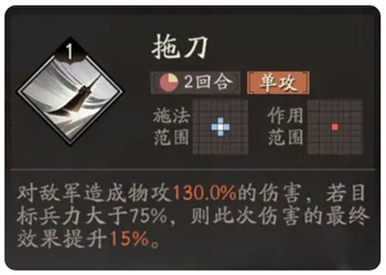 关羽的第一输出技能,3阶解锁机制为多次判定的单体攻击,搭配副将高览可最多一次击杀5名目标,立刻将攻击增益buff拉满。同时是重要的骑兵兵种斜线攻击手段,利用此特性也可以在无法击杀目标时,使用本技能白嫖对方伤害,借此缩短冷却期。